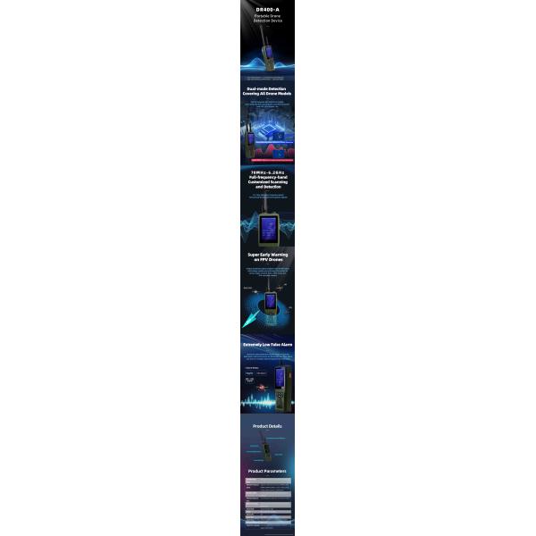 The handheld drone detection device integrates spectrum sensing technology and can effectively detect and identify various types of drones. The device adopts self-developed low-power ultra-wideband digital receiving technology, signal detection algorithm and advanced drone identification algorithm, and is connected with an efficient ultra-wideband antenna.